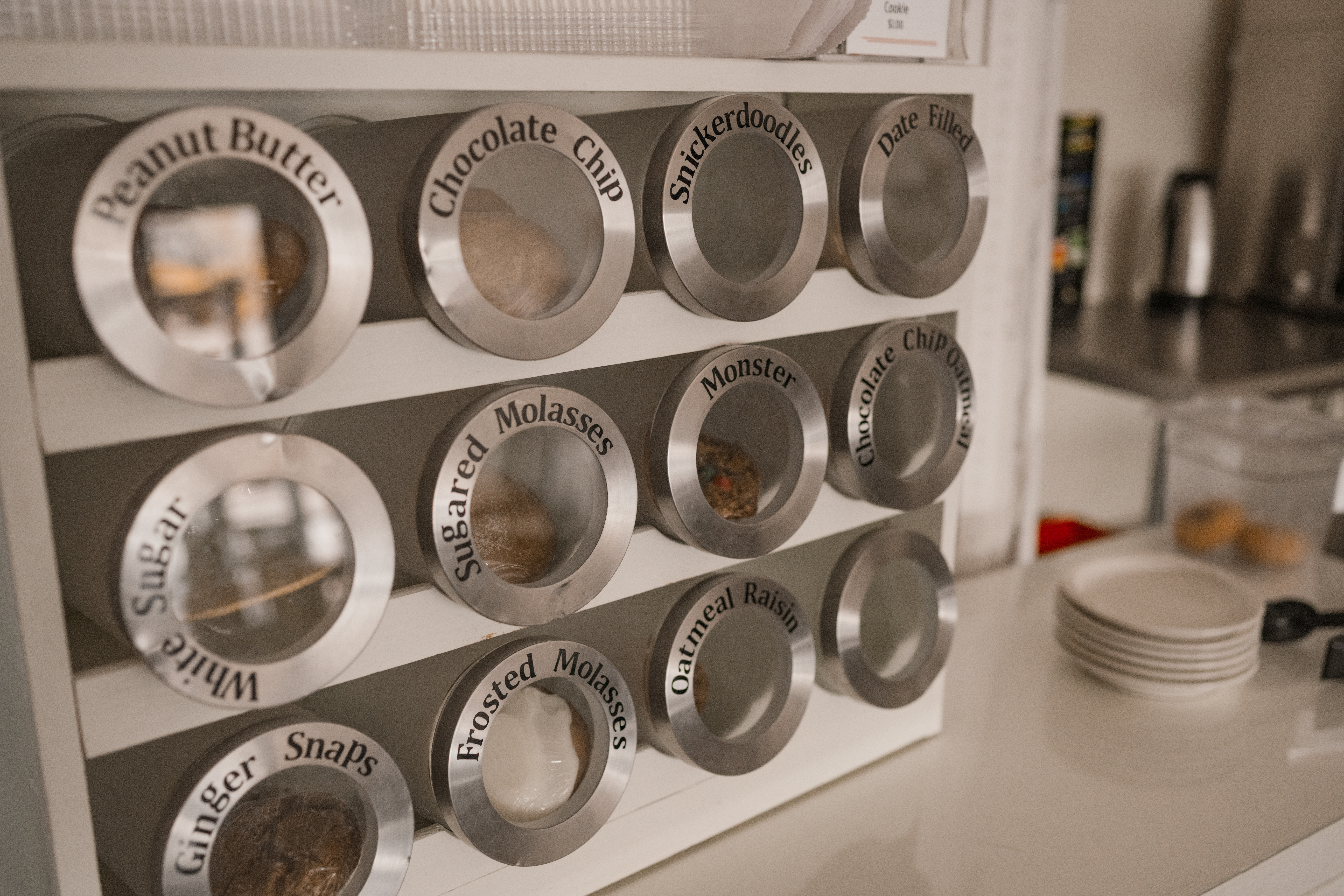 We have a wide variety of options which include Chocolate Chip, Monster, White Sugar, Snickerdoodle, Oatmeal Raisin, Frosted Molasses, Date Filled, Ginger Snap, Sugared Molasses, Peanut Butter, and Chocolate Chip Oatmeal.