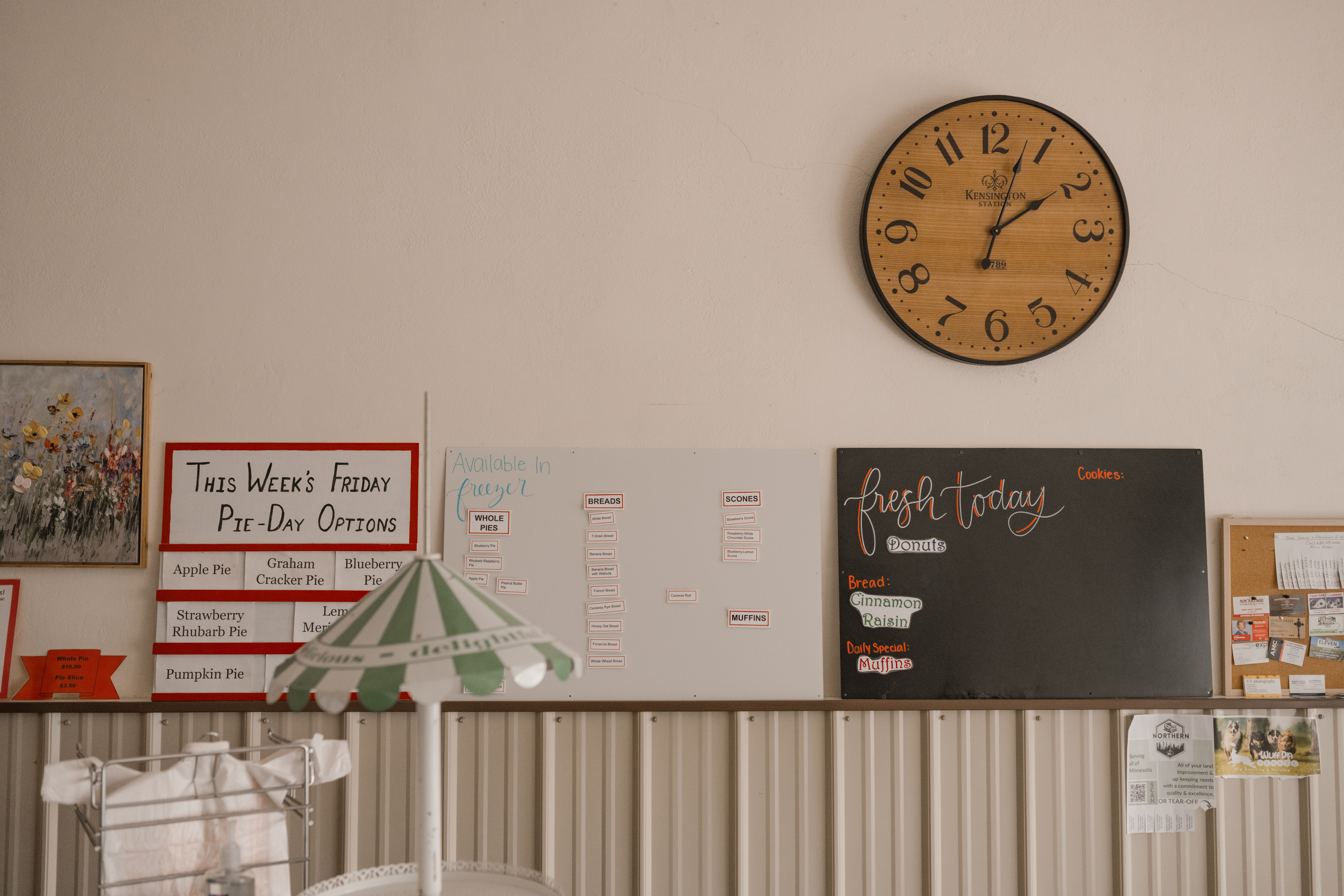 Pies are our daily special on Fridays. We make six or seven different pies each Friday on a rotating schedule. Pies can also be ordered for special dates or holidays. We bake Apple, Banana Cream, Blueberry, Bumbleberry, Chocolate, Chocolate Andes Mint, Coconut Cream, Graham Cracker, Lemon Meringue, Peach, Peanut Butter, Peanut Butter with Reese's Peanut Butter Cups, Pecan, Pumpkin, Rhubarb, Rhubarb-Raspberry, Sour Cream Raisin, and Strawberry-Rhubarb.